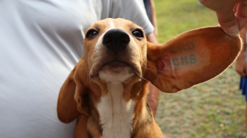 Beagle CNDCMB, pictured above, was born at an Envigo breeding facility in Cumberland, VA. He, and all his siblings, cousins, aunts, and uncles were bred for one purpose, to be sold and used in laboratory testing. He is one of 4,000 lucky dogs that will now get a chance at a life in a loving home. Many of his relatives, and other dogs and puppies from the facility, never got that chance, either dying shortly after birth, bred twice a year, every year, until their deaths, or sold to facilities where their lives would be short and miserable as they were experimented on for the sake of product development and medical testing. CNDCMB, thanks to a PETA investigation, is now free, and for the first time in his life, he felt grass and dirt beneath his paws, and the loving embrace and touch of humans who care for him even though they just met him. The best is yet to come, but it was a long journey to get here.