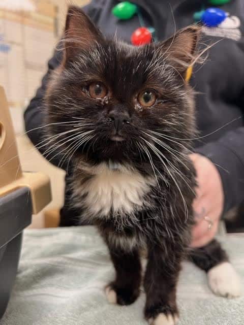 In December, in collaboration with other animal welfare authorities, we addressed a distressing situation involving three dogs, one rabbit, and a staggering number of sixty-nine cats living in a small apartment. An individual reported this situation after purchasing sick kittens from the residence. Many of these cats had untreated upper respiratory infections and some of the cats died due to the severity of their conditions. We provided medical care, food, and boarding to the surviving animals. The previous owner surrendered a large portion of the animals upon warrant issuance and has since been found guilty of multiple counts of animal cruelty. The charming cat pictured here was one of the animals rescued from the apartment.