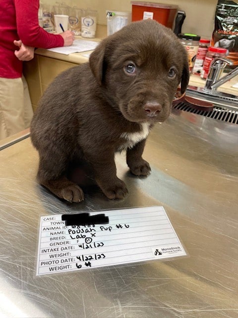 In April, we rescued twenty-two dogs (fourteen adults & eight puppies) from a New Hampshire home. We successfully brought these animals to safety by working with the state police who, aware of our expertise and strong rapport with local authorities, reached out to us for assistance. These dogs were found with untreated medical conditions and injuries, and the cost to care for these dogs grows every single day. The previous owner has since been found guilty of multiple counts of animal cruelty and neglect. The dog in the picture above had quills stuck in his chin that the previous owner knowingly left in place, and the puppy shown here was also retrieved from the same rescue effort.